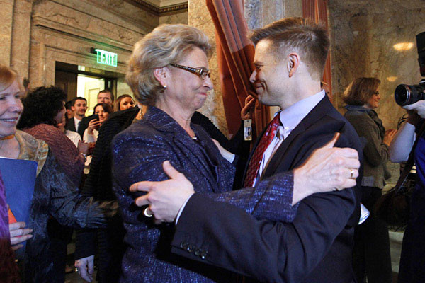 Губернатор Крис Грегуар поздравляет члена Палаты представителей Вашингтона Джейми Педерсена, открытого гея