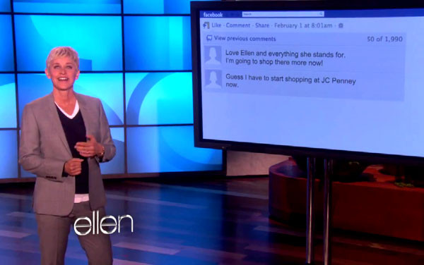 "Они [гомофобы] хотели, чтобы меня уволили, но я счастлива сообщить, что J.C. Penney остались верными своему решению сделать меня представителем компании", - заявила Эллен, добавив, что фирма не собирается подобным образом "завоевывать дополнительные голоса на выборах с помощью геев", как обвинял ее в том "Миллион матерей". Де Дженерис также пошутила, что на странице гомофобной группы в Фейсбуке зарегистрировано всего 40 тысяч пользователей, что до миллиона, заявленного в ее названии, "совсем чуть-чуть" не дотягивает. Чуть позже она процитировала некоторые отзывы, которые появились на этой странице после призыва ее уволить. Первый же из них гласил: "Я люблю Эллен и все, что она поддерживает, поэтому отныне буду совершать в этом магазине больше покупок". В следующем отзыве было написано: "Наверное, с этого момента я начну отовариваться в J.C. Penney". Еще одно послание гомофобам звучало так: "Я - христианка и представительница традиционной семьи. Я поддерживаю Эллен, а теперь и J.C. Penney!!!"