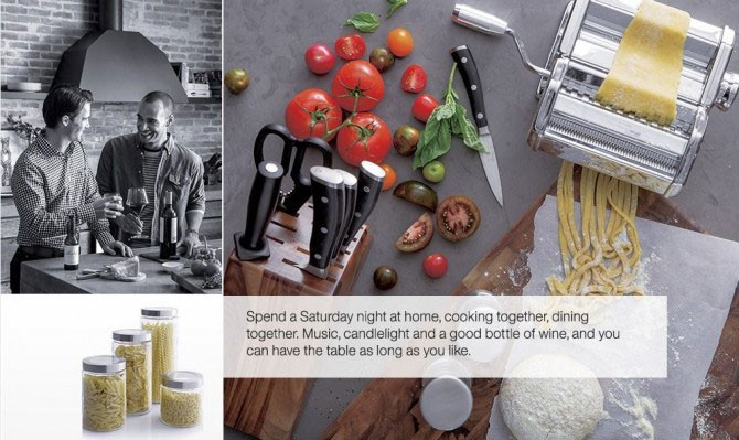 В новом каталоге Crate & Barrel под названием "Январское вдохновение 2013" мы видим двух мужчин за романтическим ужином с вином и спагетти. Надпись под фото гласит: "Проводить субботний вечер дома, готовить еду вместе, ужинать вместе. Музыка, свечи, бутылка хорошего вина - и вы можете оставаться за столом так долго, как вам захочется".