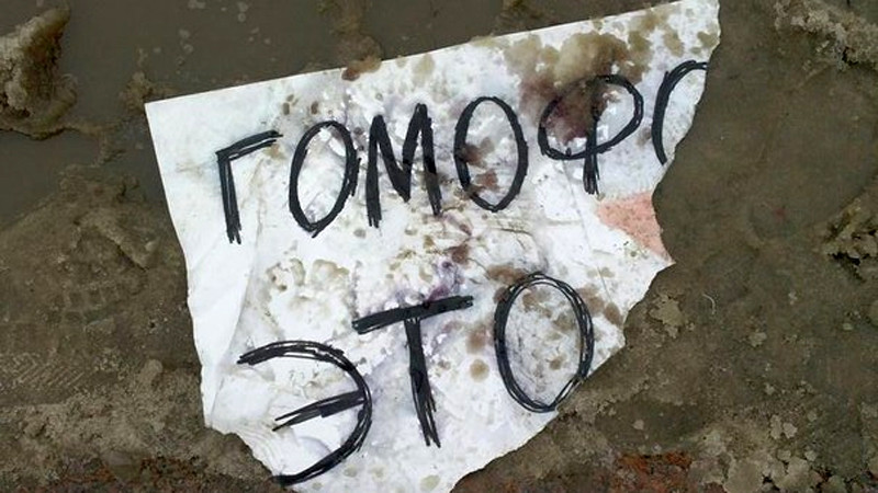 "Нацигомофобы швыряют бутылки в девчонок, попали в полицейского. С криком: Е###ь их! - толпа бросается на девчонок за кордоном ОМОНа", из Твиттера