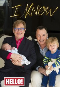 Обложка свежего выпуска журнала "Hello!": Элтон Джон прижимает к груди своего новорожденного сына, с гордостью демонстрируя его публике. Рядом с ним сидит его партнер Дэвид Ферниш и старший сын пары, Закари, которому недавно исполнилось два года.