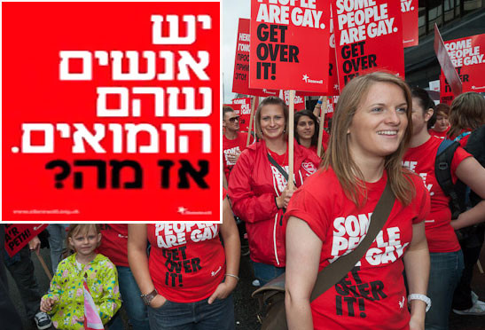 Несколько лет назад ведущая британская правозащитная ЛГБТ-организация Stonewall запустила социальную кампанию, направленную против гомофобии, лозунг которой стал известен во всем мире: "Некоторые люди - гомосексуалы. Смиритесь с этим!" (Some People Are Gay. Get Over It!). Как пишет Pinknews, сегодня этот лозунг переведен на иврит для антигомофобной кампании в еврейских религиозных школах страны.