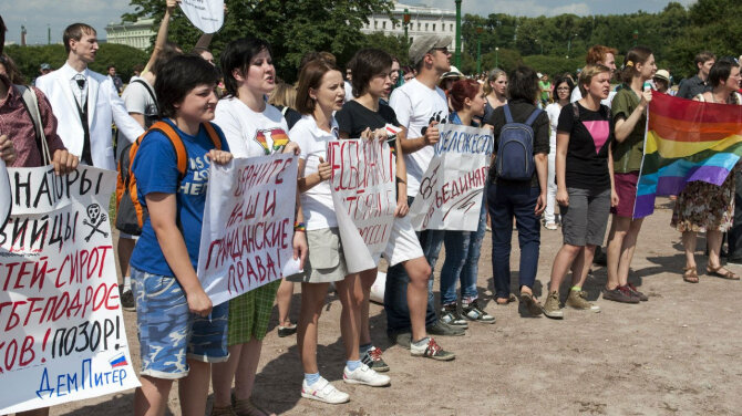 Напомним, 29 июня 2013 года мирный митинг в поддержку прав человека для ЛГБТ был прекращен полицией после того, как националисты и религиозные радикалы напали на его участников. "Начав с нецензурных оскорблений, сторонники националистических групп перешли к избиениям митингующих. В их сторону летели камни и дымовые шашки. Сотрудники полиции не предприняли достаточных действий для предотвращения насилия. Участники митинга были вынуждены защищаться сами. Они проявили настоящие мужество и силу духа. Многие из них получили ушибы и ранения. Как минимум, семь человек были позднее увезены на "скорой", - "Выход" и "Альянс гетеросексуалов..." приводят подробности беспорядков. По их мнению, "действия нападавших были заранее спланированы и скоординированы", а насилие "они оправдывали принятыми в Санкт-Петербурге и на федеральном уровне законами о запрете так называемой "пропаганды гомосексуализма" ("нетрадиционных сексуальных отношений").