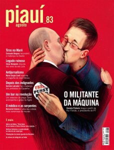 Бразильский ежемесячный журнал о культуре Piaui выходит с Владимиром Путиным на обложке. Лидер нашей страны застыл в долгом поцелуе с беглым американцем Эдвардом Сноуденом, нашедшем прибежище в России. Увлеченному поцелуем партнеру Сноуден шаловливо прикрепляет на спину наклейку Free Pussy Riot.