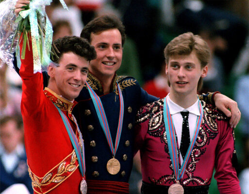 Олимпийский пьедестал в Калгари-88: Брайан Бойтано, Брайан Орсер и Виктор Петренко