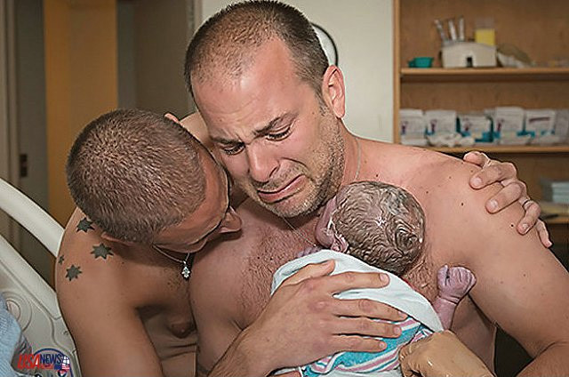 Фотограф Линдси Фостер (Lindsay Foster) поймала момент, когда новоиспеченные папаши - Би Джей и Фрэнки - впервые берут на руки своего сына Мило, только что рожденного суррогатной матерью.