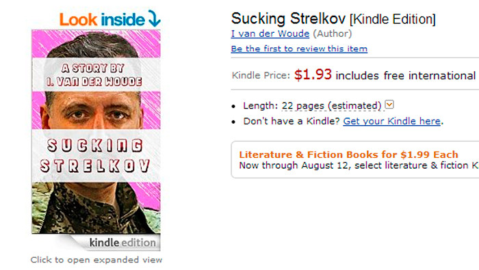 В центре 22-страничной истории под названием "Sucking Strelkov" рассказ о том, как в июне 2014 года пятеро бандитов из Западной Европы отправились в Украину с неким заданием, а в результате оказались в логове "самого злого человека в Европе", который надругался над ними под дулами автоматов... Эта эротическая чушь поступила в продажу 25 июля 2014 года в категориях "ЛГБТ-фантастики" и "эротики".
