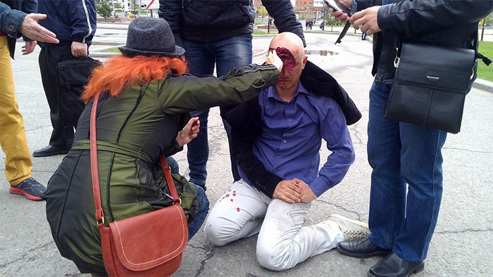 Ермошкин был избит на глазах у жителей Хабаровска и журналистов, когда вышел на акцию "Радуга над Амуром", посвященную Международному дню борьбы с гомофобией.