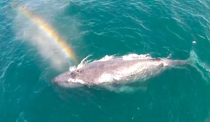 В Сети появилось видео горбатого кита, сделанное у побережья Ньюпорт-Бич в Калифорнии. В кадр попал момент, когда огромное животные выпустило фонтан, заигравший на солнце всеми цветами радуги.