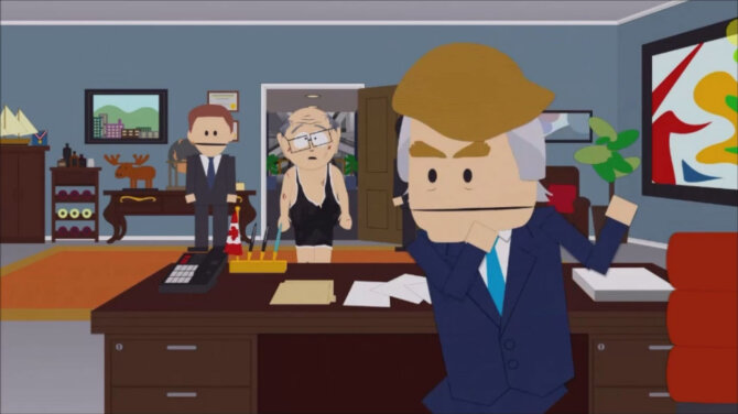 Прозрачно намекая на текущую популярность этого богатого финансиста в США, один из персонажей-канадцев рассказал о приходе Трампа к власти: "Он не предлагал никаких решений, а просто нес всякий злобный бред. Мы думали, что это смешно. Никто на самом деле не думал, что он станет президентом. Это была шутка! Но мы позволили этой шутке слишком затянуться".