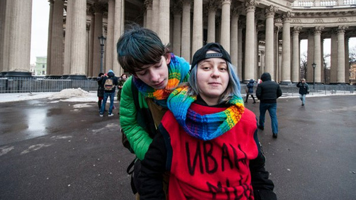 Активисты "Альянса гетеросексуалов и ЛГБТ за равноправие" сегодня в Санкт-Петербурге вышли на "прогулку против государственного террора", чтобы выразить солидарность с Иваном Красвитиным из Сызрани, пережившим нападение гомофобов.
