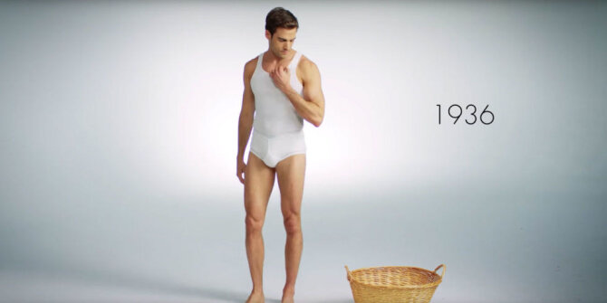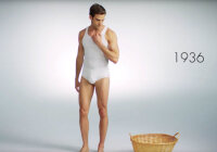 Ролик начинает со скафандра из 1916 года, который лишь отдаленно напоминает современное белье. Первый проблеск эротизма - в 1936-м. Затем послевоенные "семейники" и прочая хлопчато-бумажная жуть. И лишь в 1970-х появляются привычные хипсы и боксеры.