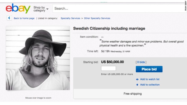 Да, не в Grindr или Tinder, а именно на сайте интернет-аукциона голубоглазый блондин из Стокгольма предлагает вступить с ним в брак за $50 000, а заодно получить шведское гражданство.