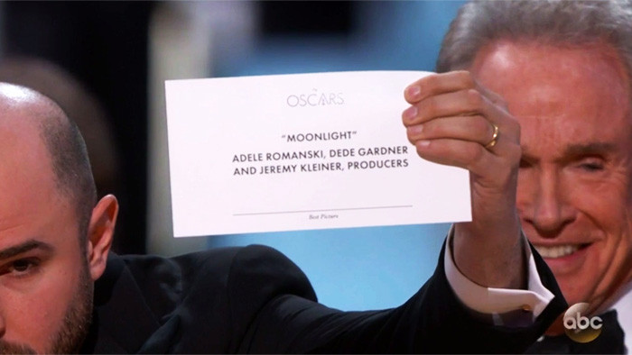Изначально 79-летний актер Уорррен Битти (Warren Beatty) назвал лучшим фильмом "Ла-Ла Ленд". На сцену вышли все создатели мюзикла. Но в последний момент ведущий Джимми Киммел спохватился и выяснил, что на карточке на самом деле был написан совсем другой фильм - "Лунный свет". Ряд СМИ сейчас утверждает, что Битти дали конверт, вскрытый при вручении номинации лучшая женская роль...