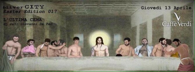 Заведение Caffe Verdi в итальянском городе Салерно использовало для рекламы гей-вечеринок по четвергам гомоэротичную пародию на знаменитую фреску "Тайная вечеря" Леонардо да Винчи.