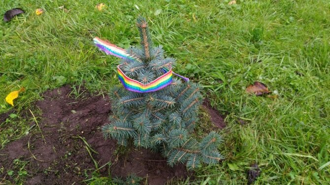 Акция "Альянса гетеросексуалов..." по посадке голубых елей с радужными ленточками приурочена к году экологии в России.