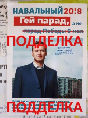 В Хабаровске перед приездом оппозиционного политика Алексея Навального на улицах города появились поддельные агитационные плакаты с лозунгами "Гей-парад, а не парад 9 мая", "Дружба с США, а не с Сирией и ДНР" и "Вывод войск из Крыма".