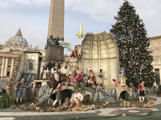Вертеп был подарен Ватикану аббатством Монтеверджине, которое находится на Юге Италии. Его спроектировал Антонио Кантоне (Antonio Cantone) в традициях неаполитанского искусства.