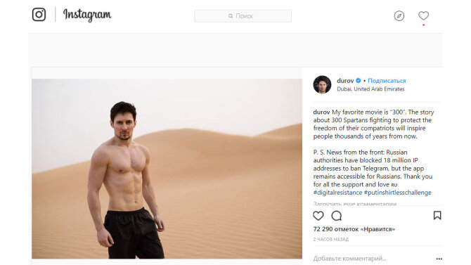 Павел Дуров, российский предприниматель, создатель кроссплатформенного мессенджера "Telegram", ранее заблокированного российскими властями, поблагодарил тех, кто участвует в "Цифровом Сопротивлении", опубликовав в своем "Инстаграме" полуобнаженную фотографию. Он добавил, что его любимый фильм "300" - история 300 спартанцев.