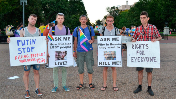 "Пора США помочь нам убраться отсюда к черту..." - заявила в 2013 году журналист Маша Гессен. И одной из первых уехала из России. А уже в сентябре 2014 года на пикет к ограде Белого дома в Вашингтоне вышли сразу семеро "свежих" российских ЛГБТ-беженцев.