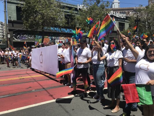Уже традиционно на гей-парад в Сан-Франциско вышла колонна сотрудников Apple, которую возглавил генеральный директор компании Тим Кук (Tim Cook). Участники шествии были одеты в футболки с радужным яблоком, на их руках были умные часы c ремешками цветов ЛГБТ-флага.