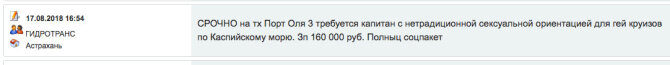 В Астрахани "Гидротранс" предлагает зарплату в 160 тыс. рублей и полный соцпакет "капитану с нетрадиционной сексуальной ориентацией". Компания ищет мужчину для гей-круизов по Каспийскому морю.
