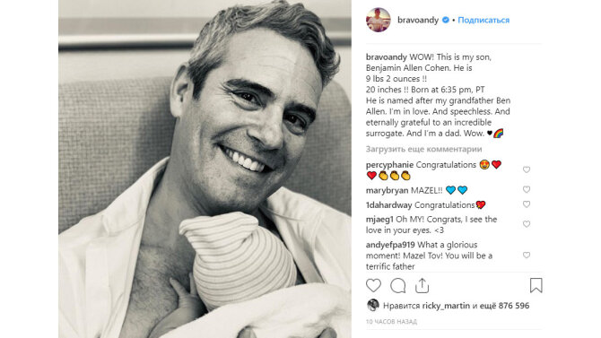 Энди Коэн (Andy Cohen), знаменитый американский телеведущий и актер, принимает поздравления с рождением сына.