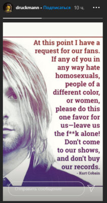 Вице-президент Naughty Dog и геймдиректор игры "Одни из нас. Часть II" (The Last of Us Part II) Нил Дракманн опубликовал в Instagram цитату лидера группы Nirvana Курта Кобейна в ответ на гомофобные комментарии.