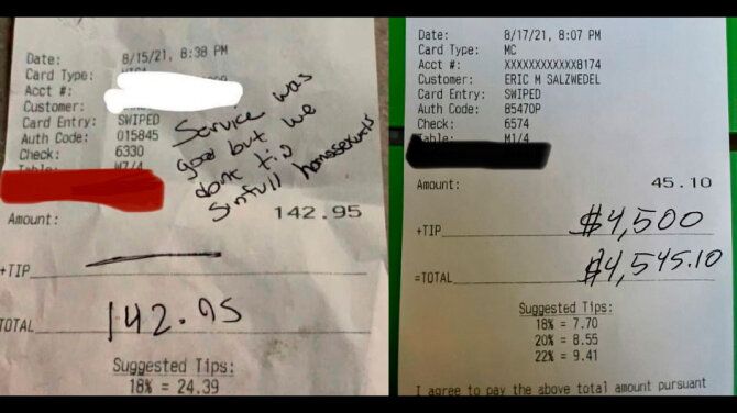 "Обслуживание было хорошим, но мы не даем чаевых грешным гомосексуалистам", - написали клиенты на чеке на сумму 143 доллара.