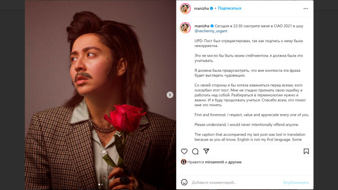 "Я должна была предусмотреть, что вне контекста эта фраза будет выглядеть чудовищно..." - написала Манижа, добавив: "Со своей стороны я бы хотела извиниться перед всеми, кого оскорбил этот пост. Мне не стыдно признать свою ошибку и работать над собой. Разбираться в терминологии нужно и важно. И я буду продолжать учиться. Спасибо всем, кто помог мне это понять".