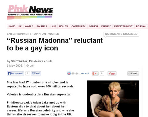 Подобные рекламки раздражают меня и сегодня, но тогда агрессивное навязывание британской ЛГБТ-публике "российской Мадонны" Валерии (да-да, именно так: вы не ослышались, и глаза вам не соврали) достало меня до самых печенок. Я с тоской вспоминала времена, когда работала ди-джеем на одной из украинских радиостанций и с удовольствием ставила в эфир песни Валерии, которые тогда выгодно отличались качеством на фоне русскоязычной "гоп-со-смыком" попсы. Валерию я не то чтобы полюбила, но, по крайней мере, считала достойной исполнительницей, творчество которой не стыдно предложить радиослушателю. А в 2008 году Валерия, за спиной которой стоял влиятельный муж-продюсер Иосиф Пригожин, решила продать себя англоязычной публике под видом гей-иконы, не гнушалась по такому случаю раздавать интервью британским гей-сайтам и на этих же сайтах крутить свою рекламу. Именно от ее рекламы я и спасалась, ибо всякий раз, когда я приходила за новостями на крупнейший британский ЛГБТ-портал Pinknews, на меня оттуда сразу же выпрыгивала Валерия. Точнее, не она сама, а рекламирующий ее благие деяния рекламный ролик, который без предупреждения начинал бодро вопить в колонках, и заткнуть его можно было только посредством отключения саунд-опций.