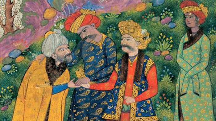 Восточные легенды связывают близостью султана Махмуда Газневи (9 в.) и его слугу Малика Аяза. Рисунок XVI в.